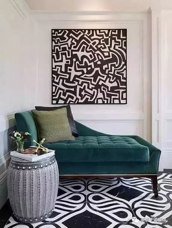 天鵝絨材質的草木綠貴妃椅平衡了幾何風地面以及墻飾的跳脫感。