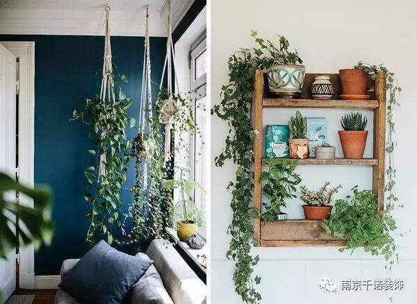 無論是想打造草木綠還是暗云杉綠家居風格,綠植都是可以起到畫龍點睛般驚艷效果的單品。對于我們來說,霧霾橫行的當下真是很有必要在屋內找些能凈化空氣的幫手。常春藤、綠蘿一類的藤蔓植物都是凈化的好手。當然單純從裝飾的角度講,藤蔓的可塑性也是很強的,既可以擺放在桌上,也可以吊掛,再或者組合柵欄、格子架裝飾都非常好看。